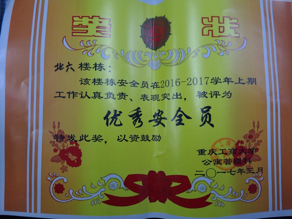 在开学第二周,我校完成了优秀安全员评选活动,全校共评选出了5名优秀安全员,北六楼栋安全员名列第二。我楼栋安全员在平时工作中积极认真负责,为楼栋的发展做出重大的贡献。这是我们楼栋的一项荣誉,也是我们楼栋干部辛勤工作的回报。